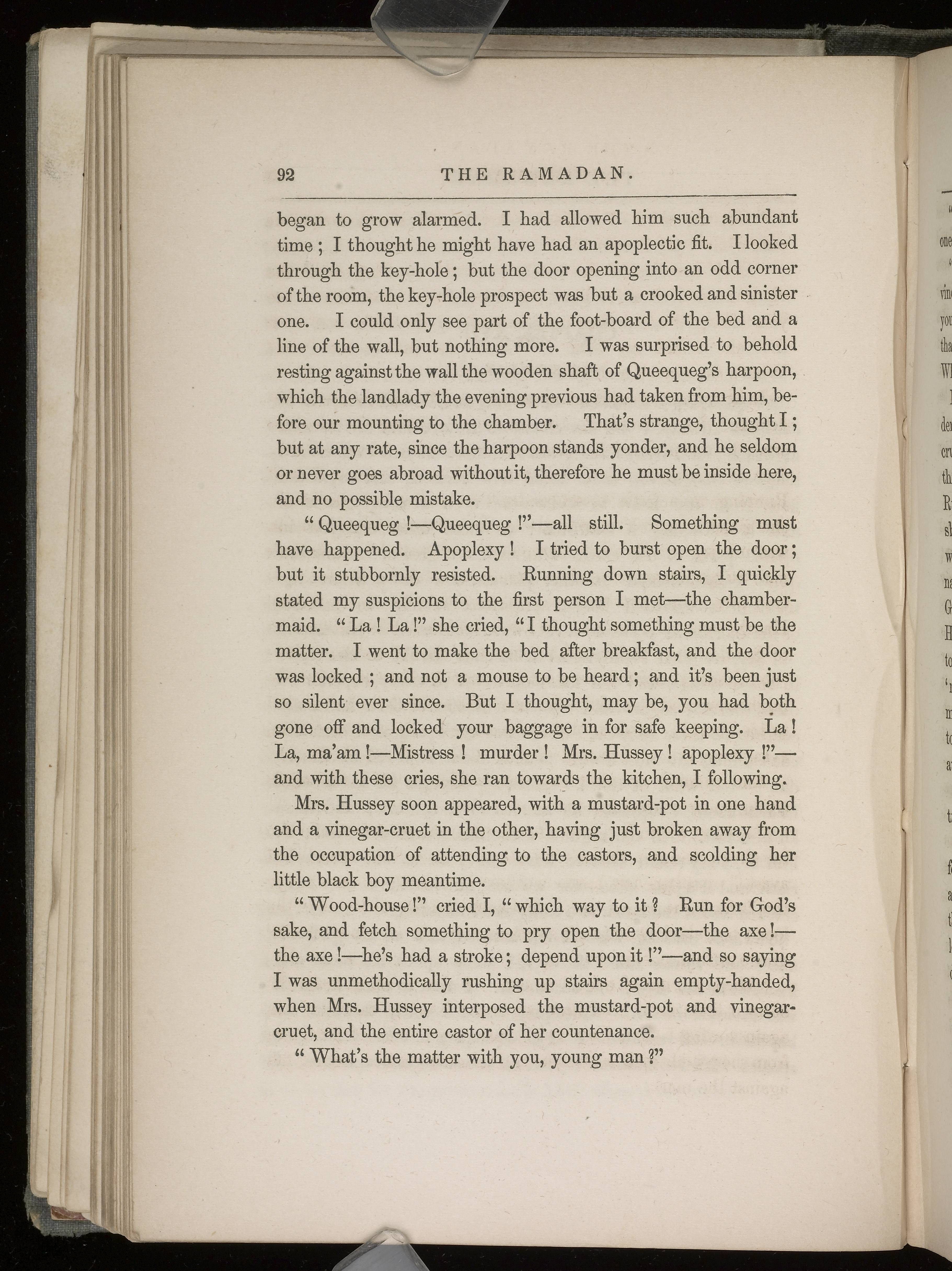 “Queequeg!—Queequeg!”—all still. Something must have happened. Apoplexy! I tried to burst open the door; but it stubbornly resisted. Running down stairs, I quickly stated my suspicions to the first person I met—the chamber-maid. “La! La!” she cried, “I thought something must be the matter. I went to make the bed after breakfast, and the door was locked; and not a mouse to be heard; and it’s been just so silent ever since. But I thought, may be, you had both gone off and locked your baggage in for safe keeping. La! La, ma’am!—Mistress! murder! Mrs. Hussey! apoplexy!”—and with these cries, she ran towards the kitchen, I following.